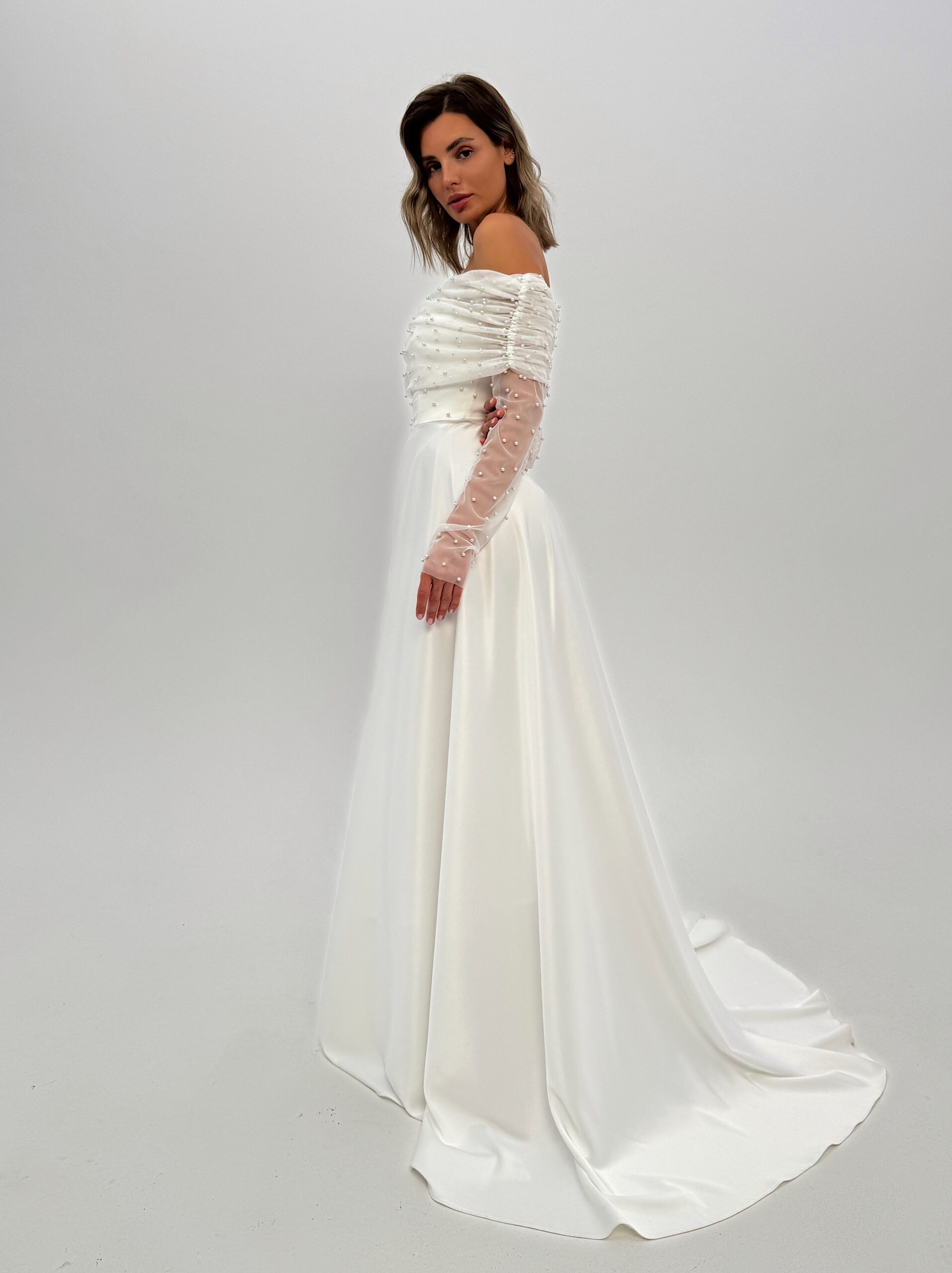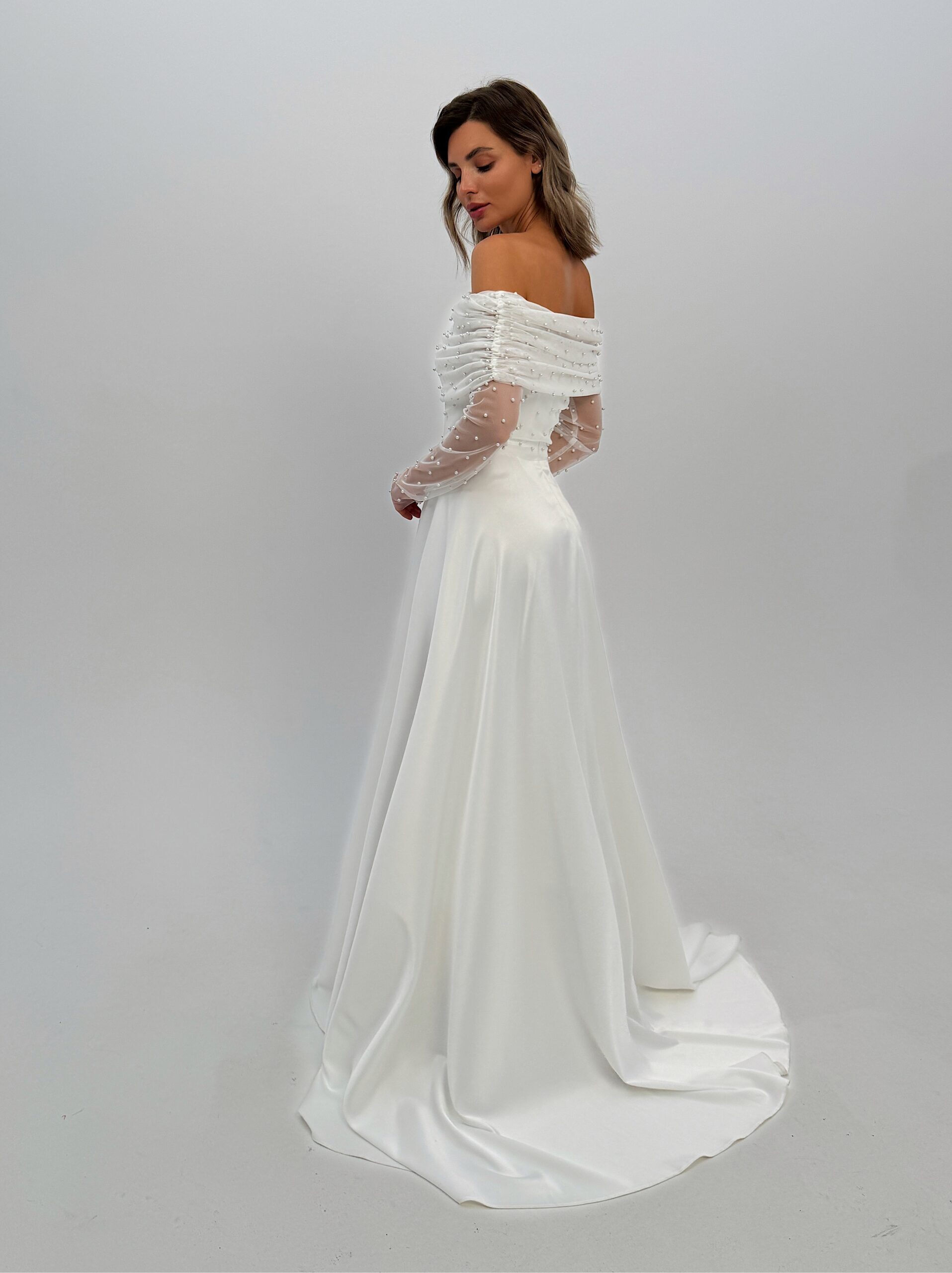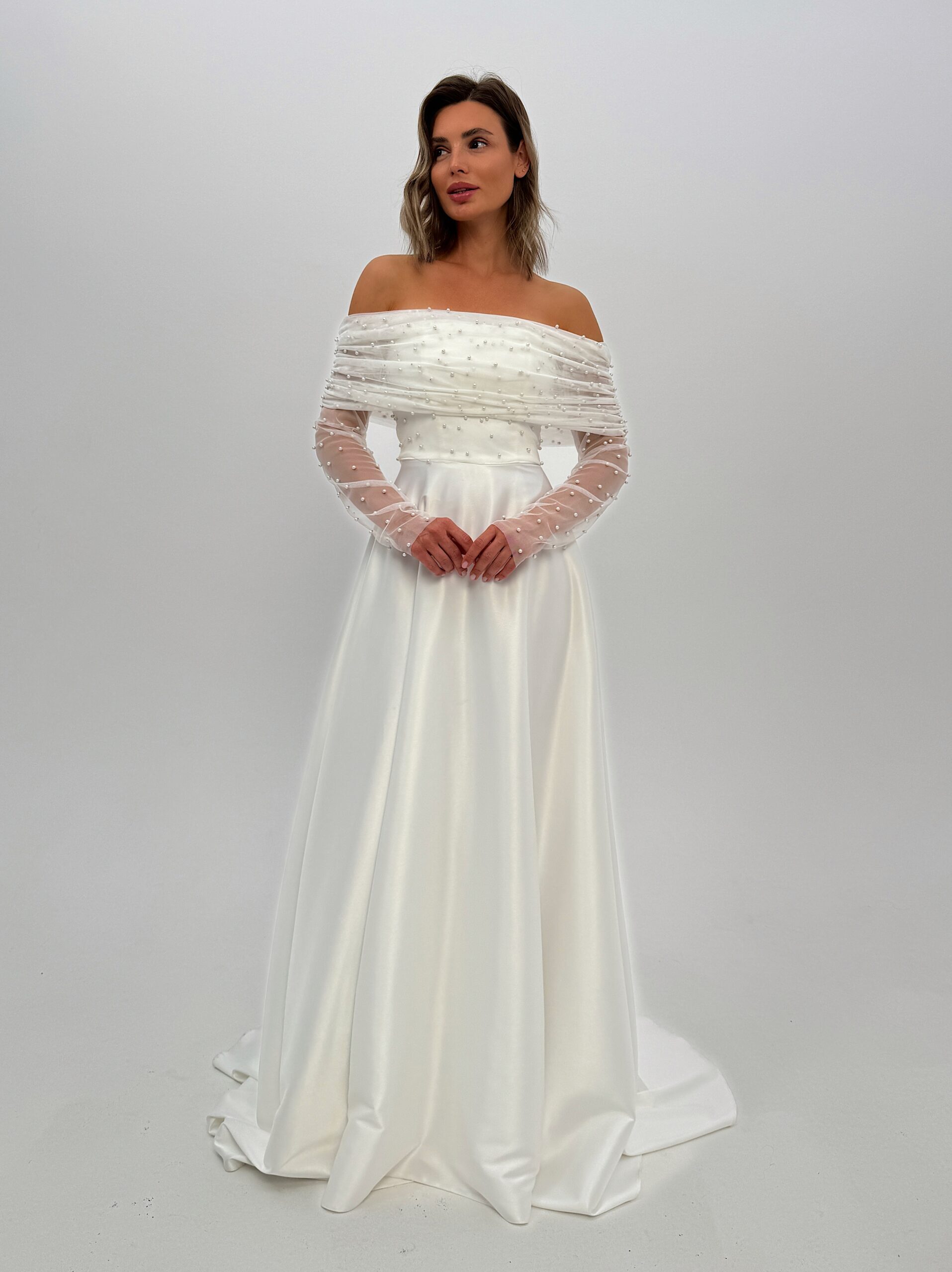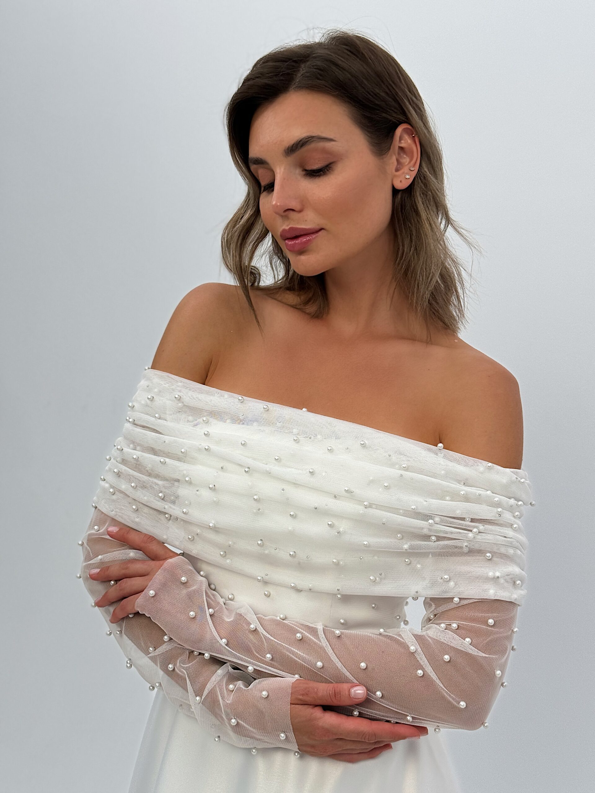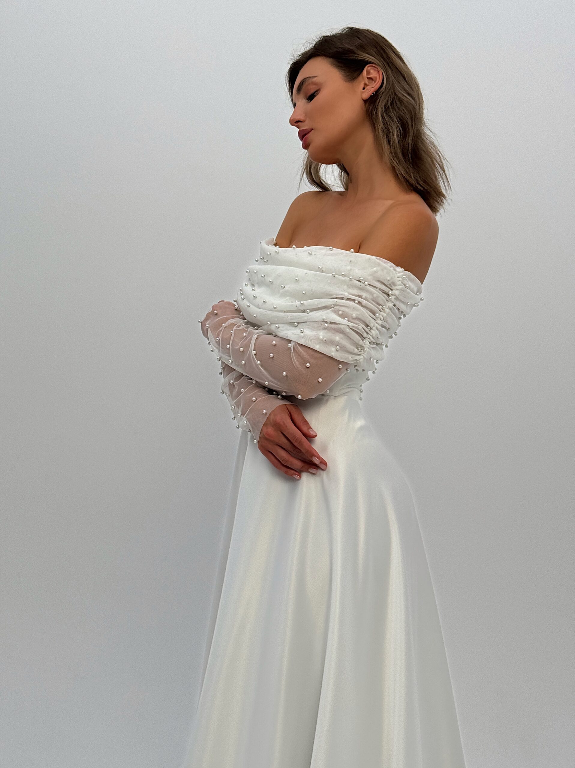 Свадебное платье от бренда с жемчугом и открытыми плечами представляет собой изысканное и романтичное наряду для особенного дня. Изготовлено из сетки с плотной фактурой, обеспечивающей комфорт и удобство при носке. Особенностью этого платья является декоративная молния, которая не только служит элементом застежки, но и добавляет образу изысканности и элегантности. Платье с открытыми плечами подчеркивает изящество и женственность, делая его идеальным выбором для свадебного торжества.Это платье подарит вам чувство уверенности и очарования в самый важный день вашей жизни! Элегантные детали, такие как изящная отделка жемчугом, подчеркивают утонченность модели. Компактное кимоно-пальто (в комплекте) завершит ваш образ, добавив нотку роскоши и стиля. С этим платьем вы будете выглядеть неотразимо – будьте готовы ловить восхищенные взгляды всех гостей вашего праздника!